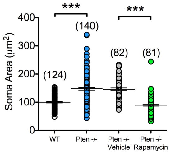 Pten- and mTOR-dependent changes in somatic area. The left two distributions are from WTs and Pten-/- mice and the right two distributions are from rapamycin- and vehicle-treated Pten-/- mice. The difference among groups was statistically significant (F(3,423) = 64.80, p < 0.001, One-way ANOVA). Bonferroni’s multiple comparisons test indicated significant differences between WT and Pten-/- mice (p < 0.001) and also between Pten-/- Vehicle and Pten-/- Rapamycin (***, p < 0.001).