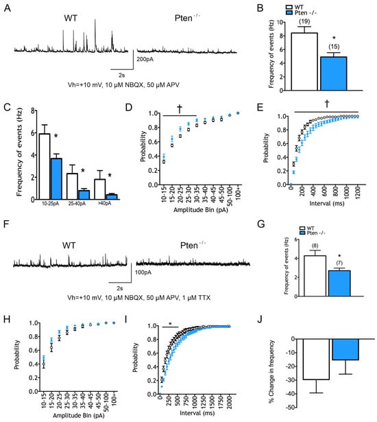 sEPSCs were recorded and found to be unchanged between groups. Notably, there was a significant reduction in the mean total frequency of sIPSCs in cells recorded from Pten-/- CPNs (4.9 ± 0.6 Hz in Pten-/- vs. 8.4 ± 0.9 Hz in WT, p = 0.006) (Figure 2A,B). This decrease was present in all bins of the amplitude–frequency distribution (F(1,32) = 8.787 for genotype effect, p = 0.0057) (Figure 2C). The cumulative amplitude probability plot showed that sIPSCs had smaller amplitudes in cells from the Pten-/- neocortex (F(1,32) = 5.089 for genotype effect, p = 0.031) (Figure 2D). The cumulative inter-event interval probability histogram showed a reduced number of events across all intervals (F(24,768) = 8.204 for interaction effect, F(1,32) = 10.64 for genotype effect, p < 0.001 and p = 0026 respectively) (Figure 2E). There were no significant changes in the kinetics of average GABAergic events.
