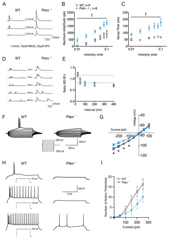Cells from the Pten-/- neocortex exhibit changes in inhibition and membrane excitability. (A) Sample eIPSC traces. (B) Significantly increased mean eIPSC amplitudes in cells from Pten-/- neocortex. (C) Significantly longer eIPSC decay times in cells from the Pten-/- neocortex. (D,E) Graphs showing no changes in paired-pulse ratios. (F) Examples of 100 ms I–V traces. (G) Significant changes in rectification in the hyperpolarizing direction in cells from the Pten-/- neocortex. (H) Examples of 1 s current injections inducing action potentials. (I) Fewer APs were generated in cells from the Pten-/- neocortex in response to depolarizing current injection. However, due to neuronal variability, the difference did not reach statistical significance.