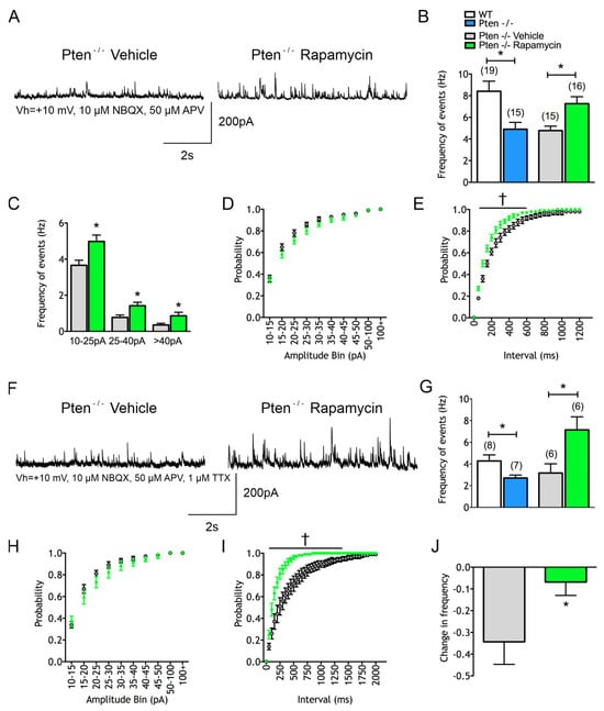 Rapamycin prevents changes in inhibitory synaptic activity within the Pten-/- neocortex. (A) Sample traces of sIPSCs. (B) Rapamycin significantly increases mean sIPSC frequency. (C,D) Rapamycin significantly increases sIPSC frequencies across amplitude bins and sIPSC cumulative amplitude plot demonstrated significantly increased amplitudes. (E) Rapamycin significantly increased the temporal proximity of sIPSC events. (F) Sample traces of mIPSCs. (G–I) Increases in mIPSCs caused by rapamycin follow the pattern of changes in sIPSCs. (J) The percent change in frequency of IPSCs following TTX was significantly reduced following rapamycin, suggesting that the majority of sIPSC events are independent of action potentials.