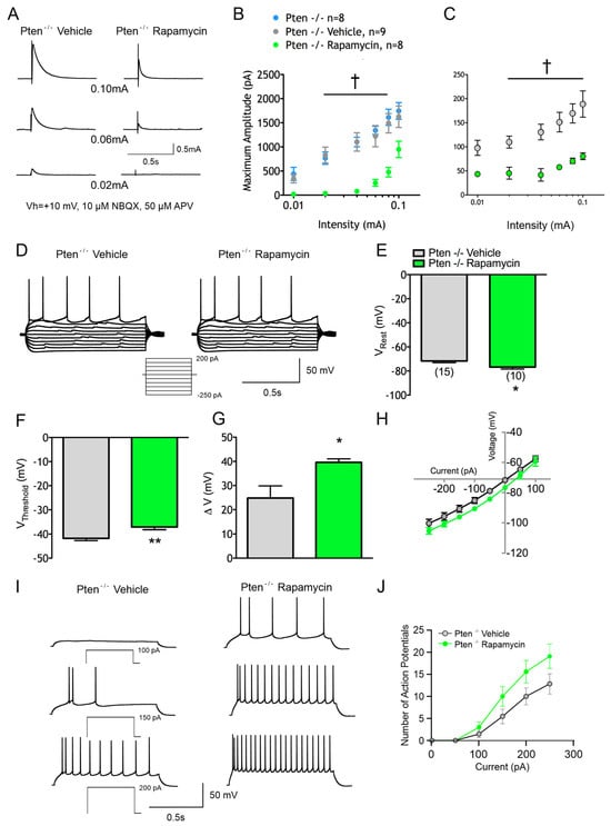 Rapamycin prevents changes in the synaptic responses and membrane excitability of the Pten-/- neocortex. (A) Sample eIPSC traces. (B) Rapamycin significantly reduced mean eIPSC amplitudes. (C) Rapamycin significantly shortens mean eIPSC decay times. (D) Sample 1 s I–V traces recorded from vehicle- and rapamycin-treated neurons. (E) Rapamycin resulted in a significantly more hyperpolarized RMP. (F) Rapamycin resulted in a significantly more depolarized threshold for the action potential. (G) Rapamycin resulted in a significantly increased voltage change to reach the threshold for APs from the RMP. (H) Rapamycin significantly shifted the I–V curve in the hyperpolarizing direction. (I,J) Rapamycin increased the number of APs generated by the injection of depolarizing current.