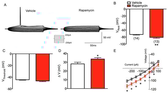 Excitability was examined in current clamp mode using the K-gluconate-based internal solution. A reduction in membrane excitability occurred (Figure 6A). Compared with the vehicle, normal CPNs recorded from chronic rapamycin-treated mice were more hyperpolarized at rest (−72.0 ± 1.7 mV in vehicle vs. −80.9 ± 2.4 mV in rapamycin, p = 0.004) (Figure 6B). Chronic rapamycin did not result in a change in the threshold potential to elicit APs (−44.38 ± 0.7 mV in vehicle vs. −46.41 ± 1.2 mV in rapamycin) (Figure 6C). Because of the more hyperpolarized RMP in rapamycin-treated neurons, the ΔV was increased (28.12 ± 1.9 mV in vehicle vs. 33.62 ± 1.6 mV in rapamycin, p = 0.04) (Figure 6D). Membrane potentials were more hyperpolarized in the rapamycin group at all current steps (F(1,26) = 12.43 for treatment effect, p = 0.0016) (Figure 6E). In the IV plots, chronic rapamycin did not alter the rectification (i.e., slope) in either direction. Instead, there was a downward (i.e., hyperpolarizing) shift in the I–V curve at all but the most depolarized membrane potential.