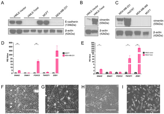 EMT status of HMLE-vector, HMLE-Twist, MCF7, and MDA-MB-231 cell lines. (A,B) E-cadherin and (C) vimentin expression was assayed by western blot. (D,E) Expression of TWIST1 and ZEB1 was assayed by qRT-PCR. (F–I) Representative images of cell morphology in (F) HMLE-vector, (G) HMLE-Twist, (H) MCF7, and (I) MDA-MB-231 cells. Scale bar represents 50 μm. Statistical analysis was performed on GraphPad Prism using one-way ANOVA significance testing; ** p < 0.01; *** p < 0.001.