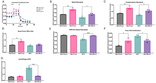 During the breakdown of glucose to lactate in glycolysis, and as an end product of the TCA cycle, protons are effluxed from the cell. The proton efflux rate (PER) is used to determine the degree of pathway activity. PER associated with glycolytic efflux is termed GlycoPER, while PER associated with the TCA cycle is MitoPER [40]. Here, we found basal PER, the sum of GlycoPER and MitoPER, to be elevated in HMLE-Twist vs. HMLE-vector, while GlycoPER was elevated in MDA-MB-231 vs. MCF7. Taken together, this indicates an elevated MitoPER in Twist-induced EMT and a higher degree of activity in the TCA cycle. However, comparing the two cancer cell lines, the minor difference in basal PER implies a higher MitoPER in the EMT(−) cell line. This aligns with MCF7 exhibiting an elevated basal respiration and higher mitoOCR/GlycoPER ratio relative to MDA-MB-231. As MitoPER is a measure of the activity of the TCA cycle, the elevated activity observed in the HMLE-Twist cells compared to HMLE-vector but not in other measures of respiration may be due to other pathways with downstream effects on the TCA cycle, such as fatty acid metabolism [44,45]. This is substantiated by the significant differences observed after the addition of 2-DG, a glycolysis inhibitor, to measure proton efflux emitted from sources other than the TCA cycle and glycolysis [40]. Both HMLE-Twist and MCF7 cell lines may be utilizing alternative sources of TCA cycle components not observed in the MDA-MB-231 cell line. This reveals a previously unknown characteristic of EMT in cancer not induced via TWIST1.