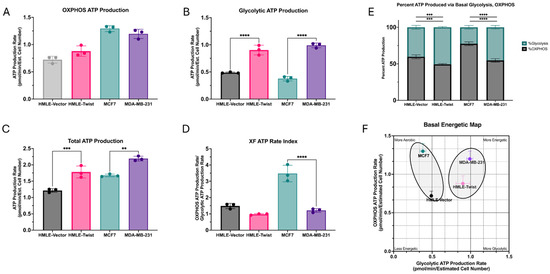 EMT(+) cells are thought to reprogram their bioenergetic pathways, supporting their enhanced proliferative and migratory capabilities [14,29,30]. Therefore, we subjected the models to the Seahorse ATP Rate Assay to better determine their metabolic profile. ATP generated from both oxidative respiration and glycolysis were determined utilizing specific metabolic inhibitors. Firstly, the ATP production rate generated from OXPHOS was found to not differ significantly between any of the cell lines (Figure 4A). However, when ATP production via glycolysis was measured, both EMT(+) cell lines, MDA-MB-231 and HMLE-Twist, were found to be significantly higher than their EMT(−) counterparts (Figure 4B). This result drives the significant differences observed in total ATP production (Figure 4C), with both EMT(+) cell lines higher than the EMT(−) cells. However, when using these values to generate the XF ATP rate index (Figure 4D), the EMT(−) MCF7 cells are found to be significantly higher than the MDA-MB-231 cells, indicative of a significantly more aerobic phenotype.