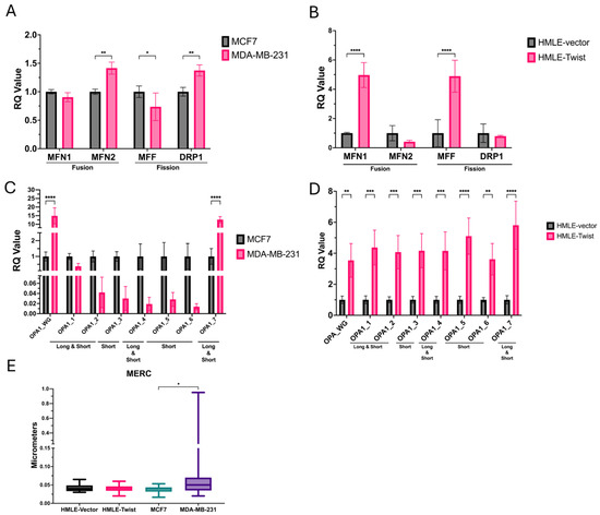 To corroborate observations from TEM imaging analysis, we analyzed mRNA expression for mitochondrial fission and fusion regulators MFN1, MFN2, MFF, DRP, and OPA1 (Figure 6A–D). In the cancer cell lines, expression of both MFN2 and DRP1 is significantly increased, while MFF expression is significantly lower in MDA-MB-231 cells compared to MCF7 cells (Figure 6A). In HMLE-Twist cells, expression of MFN1 and MFF is significantly increased over HMLE-vector (Figure 6B). OPA1 is expressed as several different isoforms (1–7) due to alternative splicing of exons 4, 4b, and 5b [37]. Spliced isoforms can encode for either or both long or short protein isoforms due to the inclusion or exclusion of protease cleavage sites. Shorter isoforms are more associated with mitochondrial fission, while longer isoforms are associated with mitochondrial fusion. Importantly, regulation of apoptosis, cristae structure, fusion, and energetics is dependent on the presence of both short- and long-form isoforms. In both models of EMT, transcriptional expression of OPA1 is increased in the EMT(+) cell lines (Figure 6C,D). However, in MDA-MB-231 cells, this difference appears to be driven by higher expression of isoform 7 (Figure 6C), which encodes both short and long protein isoforms, while other isoforms are less abundant in MDA-MB-231 when compared to MCF7 [38]. Contrastingly, expression of all OPA1 isoforms is significantly increased in Twist-induced EMT (Figure 6D). Whether OPA1 expression is regulated primarily by splicing in MDA-MB-231 cells remains to be determined. Finally, as MFN2 is involved in mitochondrial tethering to organelles, in particular, the endoplasmic reticulum (ER), we measured the contact between the two organelles [34]. In agreement with the transcriptional difference in MFN2, we observed significantly more mitochondrial–ER contact in MDA-MB-231 cells than MCF7 cells (Figure 6E). While this aligns with some previous studies reporting elevated DRP1 expression in MDA-MB-231 cells, the differences between the two models of EMT here support the context-dependent nature of mitochondrial dynamics [32,33].