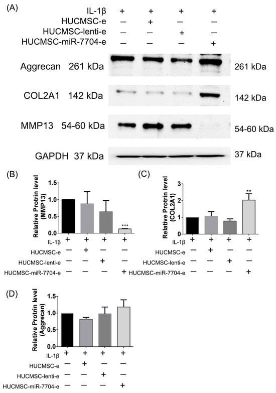 Figure 3 presents data on the effects of IL-1β stimulation and various treatments using HUCMSCs on the expression levels of aggrecan, COL2A1, and MMP13 proteins. Figure 3A displays Western blot images showing that IL-1β alone reduced the expression of aggrecan and COL2A1, while increasing MMP13 levels. The treatment with HUCMSC-miR-7704-e notably reversed these effects, showing decreased MMP13 and increased COL2A1 protein levels, while aggrecan expression remained relatively stable across treatments. Figure 3B–D present quantifications of the protein expression for MMP13, COL2A1, and aggrecan, respectively. In particular, MMP13 levels (B) were significantly reduced with the HUCMSC-miR-7704-e treatment compared to the other groups, while the COL2A1 levels (C) were significantly elevated in the HUCMSC-miR-7704-e group. Aggrecan levels (D) showed no significant changes across treatment groups. GAPDH was used as a loading control to ensure equal protein loading.