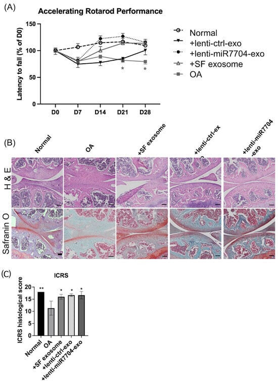 Rotarod performance test, histology, and The International Cartilage Repair Society (ICRS) score of osteoarthritis (OA) mice treated with HUCMSCs with or without transfection with lenti-ctrl or lenti-miR-7704 (n = 3 in each group). (A) Compared to the OA group, the OA mice that received HUCMSCs-EVs and lenti-miR-7704-EVs showed significant improvement after day 21. OA transplanted with lenti-ctrl EVs showed improvement on day 28. Ctrl: control, * p < 0.05. (B) The histology of the mouse OA model after 28 days of experiments (hematoxylin and eosin and Safranin O staining). The representative image of each group is illustrated. Scale bar = 100 μm. (C) The ICRS scores of the cartilage after various treatments. OA: osteoarthritis. A statistical test was performed using one-way ANOVA with a post hoc and Bonferroni test. * p < 0.05, ** p < 0.01.