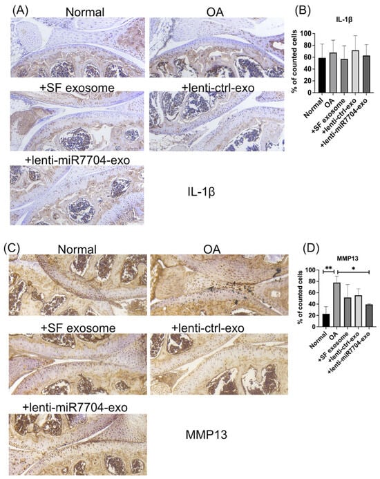 Immunohistochemical analysis of cartilage in mouse osteoarthritis (OA) model. (A) IL-1β staining image from normal knee, OA, HUCMSCs-EVs, lenti-control-EVs, and lenti-miR-7704-EVs. (B) Quantitative analysis of the percentage of positively stained cells across five randomly selected fields (mean ± standard deviation). (C) Representative image of MMP13 for each group. (D) Quantitative analysis of the percentage of positively stained cells across five randomly selected fields (mean ± standard deviation). * p < 0.05, ** p < 0.01.