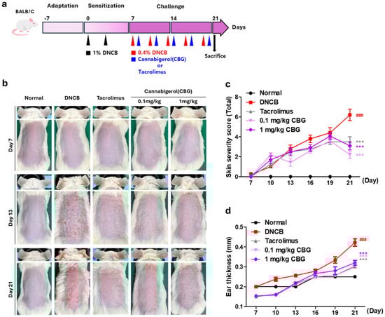 Mice were housed under standardized conditions with a 12 h light/dark cycle, at a constant temperature of 23 ± 3 °C, and 50 ± 10% humidity. They had ad libitum access to autoclaved R/O water and sterilized feed (1310, Altromin, Lage, Germany). Environmental enrichment, including mouse houses and nesting materials, was provided to enhance animal welfare. Isoflurane anesthesia (Ifran Solution, Hana Pharm. Co., Ltd., Seoul, Republic of Korea) was administered during procedures such as shaving, substance administration, and clinical evaluations to minimize animal distress. For the induction of atopic dermatitis (AD), 1-chloro-2,4-dinitrobenzene (DNCB; Sigma-Aldrich, St. Louis, MO, USA) was employed. The DNCB solution was prepared at concentrations of 1% and 0.4% in an acetone/olive oil suspension (4:1). During the first week, mice were sensitized by applying 1% DNCB to their abdomens twice. Prior to the challenge phase, dorsal hair was removed using animal clippers and hair removal cream. In the challenge phase, 0.4% DNCB was applied twice weekly for two weeks. The vehicle (acetone/olive oil 4:1), 0.1 mg/kg and 1 mg/kg of cannabigerol (acetone/olive oil 4:1), and 0.03% tacrolimus ointment were applied thrice weekly during the same period. All animal procedures were conducted in accordance with the Laboratory Animals Welfare Act, the Guide for the Care and Use of Laboratory Animals, and the Guidelines and Policies for Rodent Experiments, as approved by the Institutional Animal Care and Use Committee of the School of Medicine, The Catholic University of Korea (approval no. CUMS-2023-0142-01).