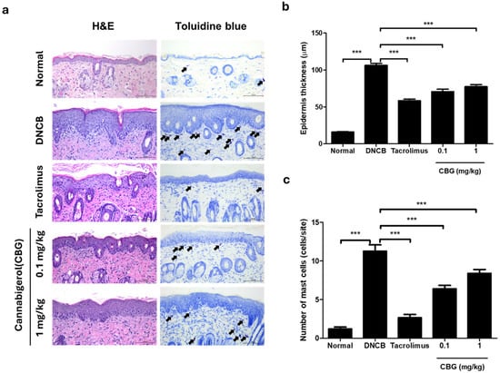 The immunological characteristics of AD patients include the infiltration of inflammatory cells and mast cells around the lesions and epidermal hyperplasia. The histopathological characteristics of dorsal skin tissues were analyzed by hematoxylin-eosin (H&E) staining and toluidine blue staining (Figure 3a). In H&E staining, the DNCB group showed epithelial hyperplasia and keratinization compared to the normal group (p < 0.001), and 0.1 mg/kg CBG and 1 mg/kg CBG treatment significantly reduced epidermal thickness (p < 0.001) (Figure 3b). Quantification of mast cell number by toluidine blue staining showed that the number of mast cells was significantly higher in the DNCB group (p < 0.001), but 0.1 mg/kg CBG and 1 mg/kg CBG treatment significantly reduced the number of mast cells (p < 0.001) (Figure 3c).