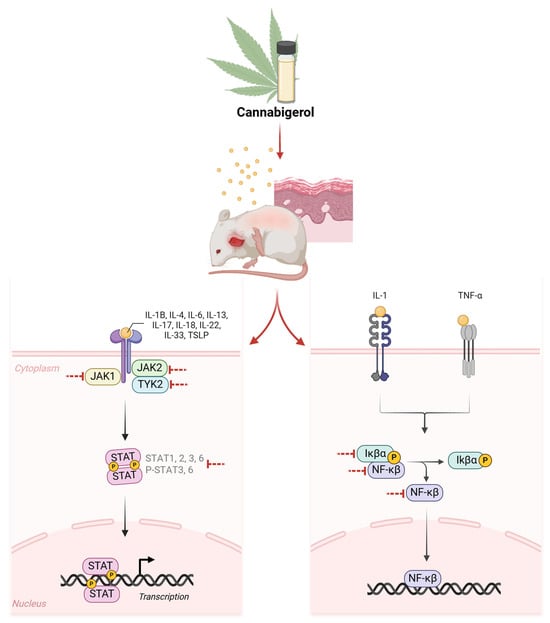 In conclusion, our study demonstrates the therapeutic benefits of CBG in AD models. CBG inhibited some of the inflammatory cytokines and chemokines in AD cell models. In the mouse model, it inhibited inflammatory cytokines and JAK/STAT signaling (Figure 6), which was accompanied by improvement in histological assessments, including skin clinical scores. These results suggest that CBG may also affect the integrity of the skin barrier, including NF-κB signaling, and suggest that CBG is a potential treatment for AD.