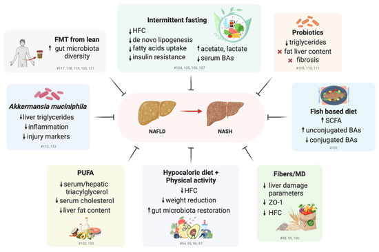 Healthy lifestyles and gut microbiome modulation concur to reduce NAFLD progression to NASH by reducing steatosis and improving markers of hepatic damage. HFC: hepatic fat content; BAs: bile acids; SCFA: short-chain fatty acids; MD: Mediterranean diet; ZO-1: zonulin-1; PUFA: polyunsaturated fatty acids; FMT: fecal microbiota transplantation. Numbers preceded by “#” indicate the reference article.