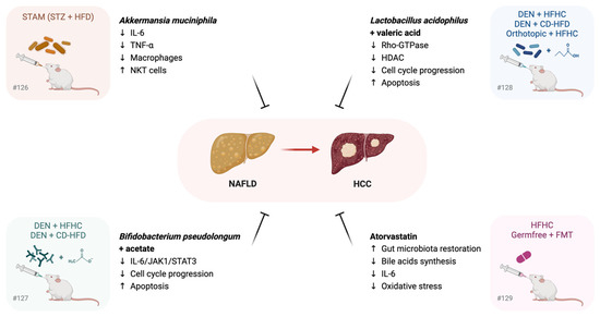 Given the high incidence of NAFLD worldwide, NAFLD and NASH are becoming the most frequent etiologic factors for HCC; in fact, NAFLD patients with high-grade fibrosis have a sevenfold higher risk of tumor development in comparison to those without liver disease. NASH-related HCC is increasingly diagnosed in the clinical setting and is the most rapidly growing HCC indication for liver transplantation in the United States [124]. Since no established therapeutic approaches are available to inhibit NAFLD progression in clinical practice, here, we will review the most recent studies investigating the modulation of the GM to prevent/slow down the transition from NAFLD/NASH to HCC in the preclinical setting. Indeed, despite the recent approval of Resmetirom for MAFLD treatment [90,91], information regarding HCC prevention is not yet available.