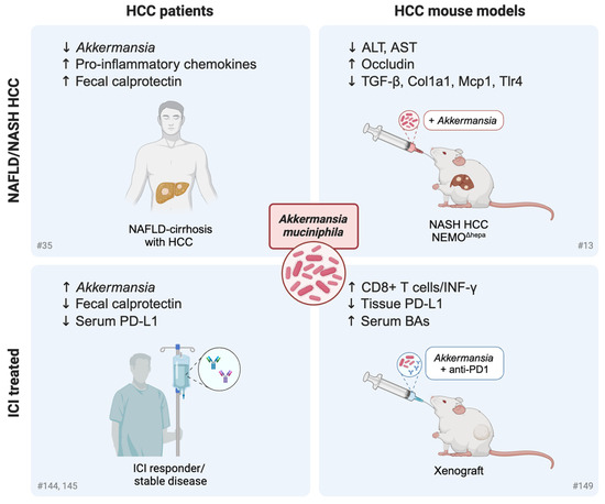 A preclinical study by Schneider and coworkers reported the influence of dysbiosis, obtained by Nlrp6 gene knockout, on the tumor microenvironment in a steatohepatitis-HCC mouse model (NEMOΔhepa). The authors demonstrated that bacterial translocation, due to the presence of a leaky intestinal barrier, affected the antitumoral response by expanding monocytic myeloid-derived suppressor cells (mMDSCs) and suppressing CD8+ T cell proliferation [13]. As a proof of principle, antibiotic treatment and A. muciniphila administration reduced liver transaminase levels in NEMOΔhepa/Nlrp6-/-, mice proving that (1) microbial dysbiosis has detrimental effects on liver injury and (2) A. muciniphila supplementation can have a beneficial effect even in the presence of host-derived factors that promote dysbiosis, such as NLRP6 deficiency. Similarly, cirrhotic patients showed a close association between bacterial translocation and activation of fibrogenic and pro-inflammatory pathways that interfere with cancer immunosuppression, highlighting the strict gut–liver crosstalk during disease progression. In line with this, another study reported the overgrowth of fecal E. coli in cirrhotic patients with HCC, suggesting its contribution to malignant transformation in cirrhotic patients [40].