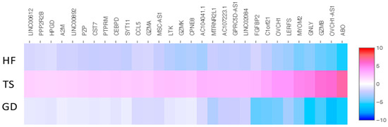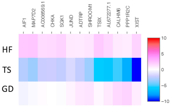 The heatmap of thirteen shared down-expressed genes in a patient with TS compared with both an HF and a patient with GD. Values are presented on a Log2 scale.