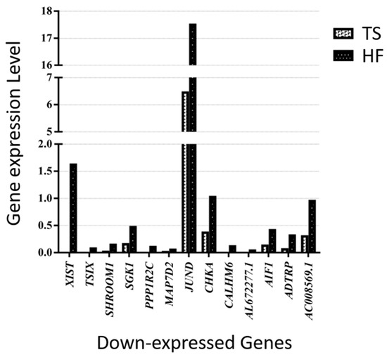 Thirteen down-expressed genes in a patient with TS compared with an HF.