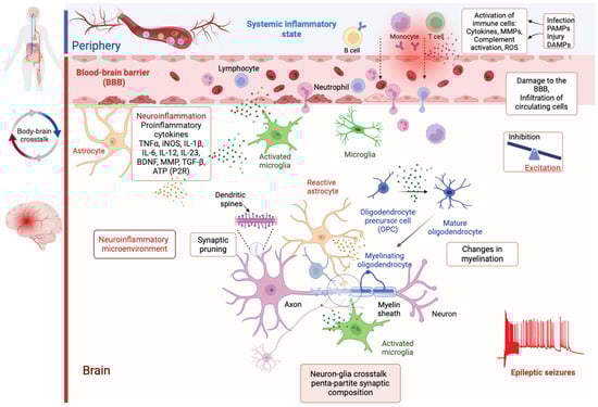 Interplay between systemic inflammation, neuroinflammation, and neuron–glia crosstalk in epilepsy. In a healthy brain, the primary cell types include neurons, astrocytes, microglia, oligodendrocytes, and oligodendrocyte precursor cells (OPCs). They are now recognized as essential synaptic partners forming the penta-partite synaptic composition. Neurons connect via long axonal processes and form synapses to communicate. Astrocytes interact with blood vessels to form the blood–brain barrier (BBB) and maintain neuronal synapses. Microglia, the innate immune cells of the CNS, phagocytose apoptotic cells and prune inactive synapses. Oligodendrocytes support axons by forming the myelin sheath that insulates axons, allowing for rapid conduction of action potential in the CNS. Various factors that contribute to the activation of immune cells lead to the release of cytokines, matrix metalloproteinases (MMPs), oxidative stress (reactive oxygen species—ROS), and complement activation. This systemic inflammatory response alters the BBB integrity/permeability, facilitates the infiltration of peripheral immune cells into the CNS, and activates microglia and astrocytes, further amplifying inflammation and BBB leakage in the CNS. Dotted arrows indicate the infiltration of circulating cells into the brain. B cells that cross the BBB can produce brain-reactive antibodies that can interfere with presynaptic and postsynaptic proteins and activate an autoimmune reaction within the CNS. Reactive astrocytes and activated microglia initiate an inflammatory cascade, releasing cytokines, chemokines, inflammatory mediators, and ROS, which can lead to excitotoxicity, oxidative stress, demyelination, increase in synaptic pruning, and apoptosis. Reactive glia releases extracellular matrix remodeling enzymes such as MMPs, neurotrophic factors such as brain-derived neurotrophic factor (BDNF), growth factors such as transforming growth factor-β (TGFβ) and cytokines that modulate the expression and function of receptors, transporters, ion channels, enzymes, other synaptic proteins, and molecules implicated in excitatory and inhibitory neurotransmission. MMPs can aggravate BBB impairment by damaging the tight junction proteins and promote infiltration of immune cells and serum proteins such as albumine in the brain. As a result, network hyperexcitability and seizures are promoted in this neuroinflammatory microenvironment. Created in BioRender 2024. (https://BioRender.com/t81x673, accessed on 10 November 2024).