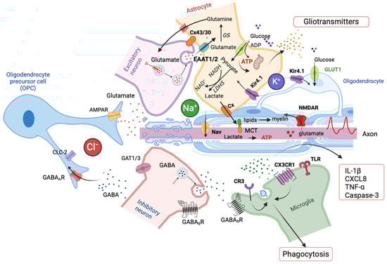 Neuron–glia crosstalk in penta-partide synaptic composition. The schematic illustrates the complex interactions between neurons and glial cells (astrocytes, microglia, oligodendrocytes, and oligodendrocyte precursor cells (OPCs)) that contribute to epileptogenesis. It highlights key pathways and molecular mechanisms within a neuroinflammatory microenvironment, emphasizing the role of ion homeostasis (e.g., K+, Na+, Cl−), gliotransmitter release from reactive astrocytes, and excitatory and inhibitory synaptic signaling. Accordingly, the changes in glial membrane expression and trafficking of inwardly rectifying potassium (K+) channel 4.1 (Kir4.1), excitatory amino acid transporter (EAAT1/2), and the GJ proteins connexin 43/30 (Cx43/30) results in an increase in extracellular concentrations of K+ and glutamate, which promotes network hyperexcitability and seizures. The figure also explores metabolic support, oligodendrocyte involvement in myelin and lipid transfer, and direct interactions of OPCs with both excitatory and inhibitory neurons. Additionally, microglia are depicted in their roles in cytokine release and phagocytosis. Created in BioRender 2024 (https://BioRender.com/c12o944, accessed on 10 November 2024).