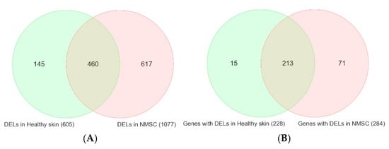 - DELs common in NMSC and healthy skin: A total of 1729 DEL events representing 460 unique genomic coordinates (light green and light pink overlapping region in Figure 1A).