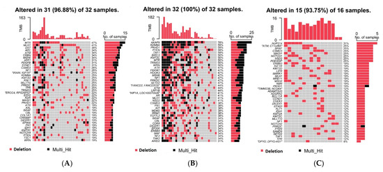 Figure 2A–C show the top 40 genes in each of the above three groups. It may be noted that if we look at a single gene, for example, BRAF, there are some DELs in BRAF that may be found in healthy skin tissue; DELs in some other location of BRAF are only found in NMSC, and yet other DELs in BRAF may be found in both NMSC and healthy skin tissue. Therefore, the identification of tumor-specific DELs or mutations is important.