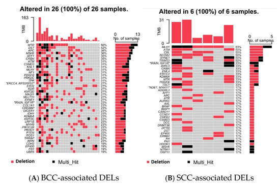 Then, from the NMSC-associated DELs, we identified BCC-associated DELs (found only in BCC cases but not in healthy skin tissue) among the 26 patients with BCC and SCC-associated DELs (found only in SCC cases but not in healthy skin tissue) among the 6 patients with SCC (see Figure 3). One gene may have multiple BCC-associated DELs. If an individual patient had any of the BCC-associated DELs in a particular gene (e.g., MTR), we considered the patient as having MTR DEL. The percentage of patients showing BCC-associated DELs in a particular gene is also shown on the right side of Figure 3. For example, 50% of the patients with BCC (13 out of 26) had BCC-associated DELs in the MTR gene. Considering the fact that we had only six patients with SCC, for further analysis we considered only the twenty-six patients with BCC. The number of BCC tissue samples and healthy skin tissue samples with or without BCC-associated DELs in frequently mutated genes is also shown in Supplementary Table S3.
