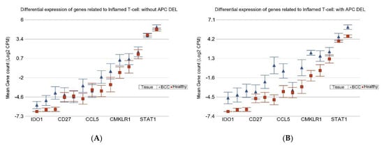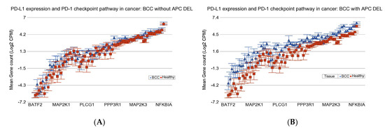 Differential gene expression of the PD-L1 and PD-1 checkpoint pathway in BCC tissue (in blue) compared to healthy skin tissue (in red). BCC tissues with no APC DELs are shown on the left (A), and BCC tissues with APC DELs are shown on the right (B). Genes are arranged on the x-axis by expression level, and the log2-transformed gene count per million (CPM) is shown on the y-axis. Gene symbols for all the genes could not be shown on the x-axis.