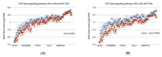 Differential gene expression of TGF-β pathway in BCC tissue (in blue) compared to non-lesional skin tissue (in red). BCC tissues with no APC DELs are shown on the left (A), and BCC tissues with APC DELs are shown on the right (B). Genes are arranged on the x-axis by expression level, and the log2-transformed gene count per million (CPM) is shown on the y-axis. Gene symbols for all the genes could not be shown on the x-axis.