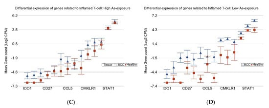 Differential expression of inflamed T-cell genes in BCC tissue (in blue) compared to healthy skin tissue (in red). In the upper panel, BCC tissues with no APC DELs are shown on the left (A) and BCC tissues with APC DELs are shown on the right (B). In the lower panel, BCC tissues from patients with high As exposure are shown on the left (C), and BCC tissues from patients with low As exposure are shown on the right (D). Genes are arranged on the x-axis by expression level, and the log2-transformed gene count per million (CPM) is shown on the y-axis. Gene symbols for all the genes could not be shown on the x-axis.
