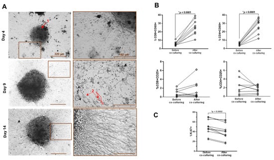 Characteristics of G-EXP-L model. (A) Phase contrast microscopy of patient-derived G-EXP-L model on days 4, 9, and 14 of cultivation. The components of the model are shown by the numerated arrows: 1—adherent tumor fragment, 2—adherent tumor cells, 3—lymphocytes. (B) Expression of the activation markers CD69 and CD25 in live CD4+ and CD8+ T-cells before and after co-culturing with glioma explants. Dot plots show the measurements for the individual patients (dots), and horizontal lines connect the values for the same patient before and on day 14 of co-culturing. (C) Expression of proliferation marker Ki67 in tumor explants before and on day 14 of co-culturing. Dot plots show the measurements for individual patients (dots), and horizontal lines connect the values for the same patient before and after co-culturing. Statistics: paired Student’s t-test. * Significant difference, p ≤ 0.05.