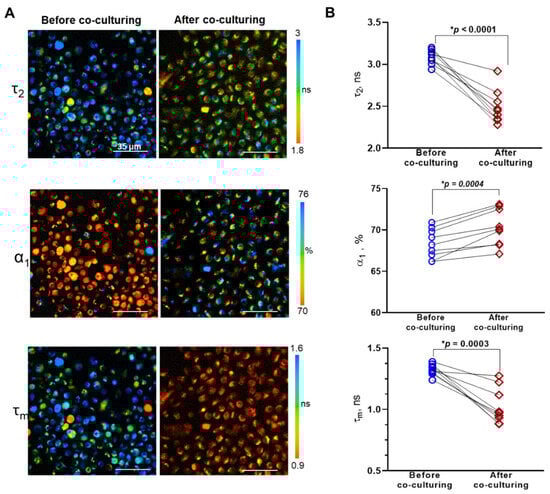 FLIM of NAD(P)H in lymphocytes before and after co-culturing with glioma explants. (A) Representative FLIM images of lymphocytes before and after co-culturing. The long lifetime component of NAD(P)H τ2, the relative contribution of free NAD(P)H α1, and the mean lifetime τm are shown. (B) Coupled comparisons of fluorescence decay parameters (τ2, α1, τm) before and after co-culturing. Dots are the measurements for individual patients. Coupled comparisons of NAD(P)H-α1 before and after co-culturing. Dots are the mean values for individual patients. Lines connect the values before and after co-culturing for the same patient. Statistics: paired Student’s t-test. * Significant difference, p ≤ 0.05.