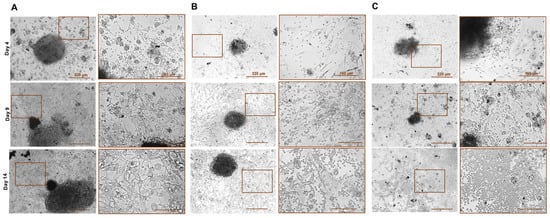 Adherent tumor fragments (explant) had a round, oval, or irregular shape and inhomogeneous structure with a light periphery consisting predominantly of living proliferating cells and a dark inner core containing a number of dead cells (Figure 1A). During 14 days of culturing, most tumor fragments increased in size (from 100 to 350 μm in diameter on day 4 to a size of 400–600 μm in diameter on day 14), and their structure became denser—the dark central core with necrotic areas increased, while the layer of proliferating cells at the periphery was preserved.