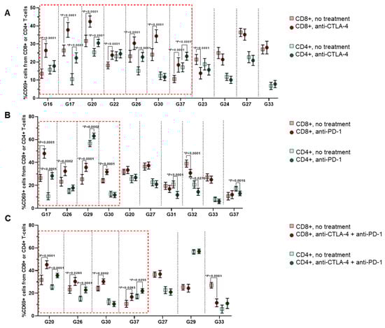 Expression of the activation marker CD69 in CD8+ or CD4+ T-lymphocytes in the G-EXP-L models after immunotherapy with anti-CTLA-4 (A), anti-PD-1 (B), or their combination (C). Dot plots show measurements for individual patients (dots) and SEM (horizontal lines). The red boxes indicate the cases of a significant rise in the percentage of CD69+ cells, either in the CD8+ T-cell subset or both CD8+ and CD4+ T-cells. Statistics: Mann–Whitney U test. * Significant difference, p ≤ 0.05.