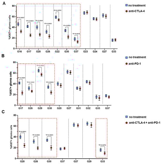 With the anti-CTLA-4 and the anti-PD-1 treatment, all the “responsive” and “partially responsive” models demonstrated statistical decrease in the percentage of Ki67+ glioma cells in comparison with corresponding untreated controls (Figure 5). In all “non-responders” Ki67 proliferative index did not change after the treatment.