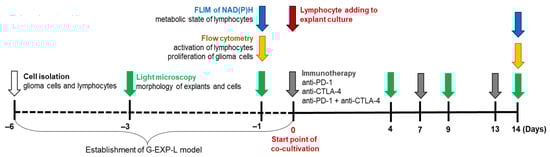 The experimental workflow is demonstrated in Scheme 1. At the first stage (from day −6 to day 0), patient-derived explants of glioma and, in parallel, lymphocyte cultures were established and characterized by light microscopy, FLIM, and flow cytometry. On day 0, lymphocytes were added to glioma explants simultaneously with immunotherapeutic agents. At the second stage (from day 0 to day 14), the resulting patient-specific G-EXP-L (Glioma-EXPlant-Lymphocytes) models were treated on days 7 and 13. Morphological phase contrast images of the treated and untreated control G-EXP-L models were obtained on days 4, 9, and 14 of co-culturing. Flow cytometry and FLIM were performed 14 days after the start of treatment.