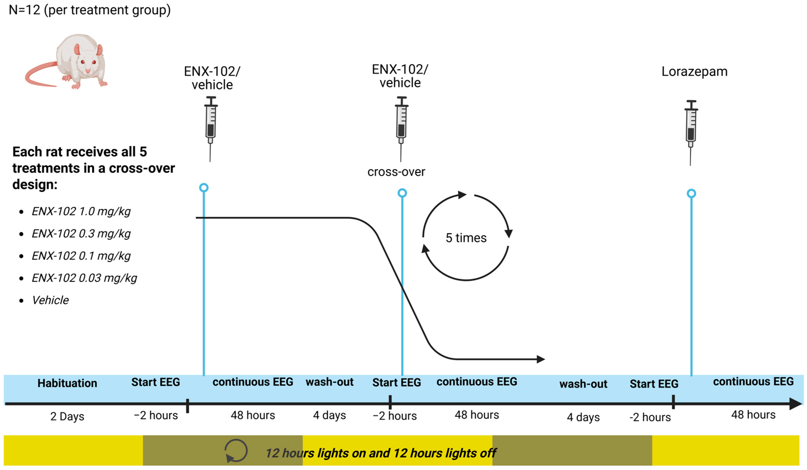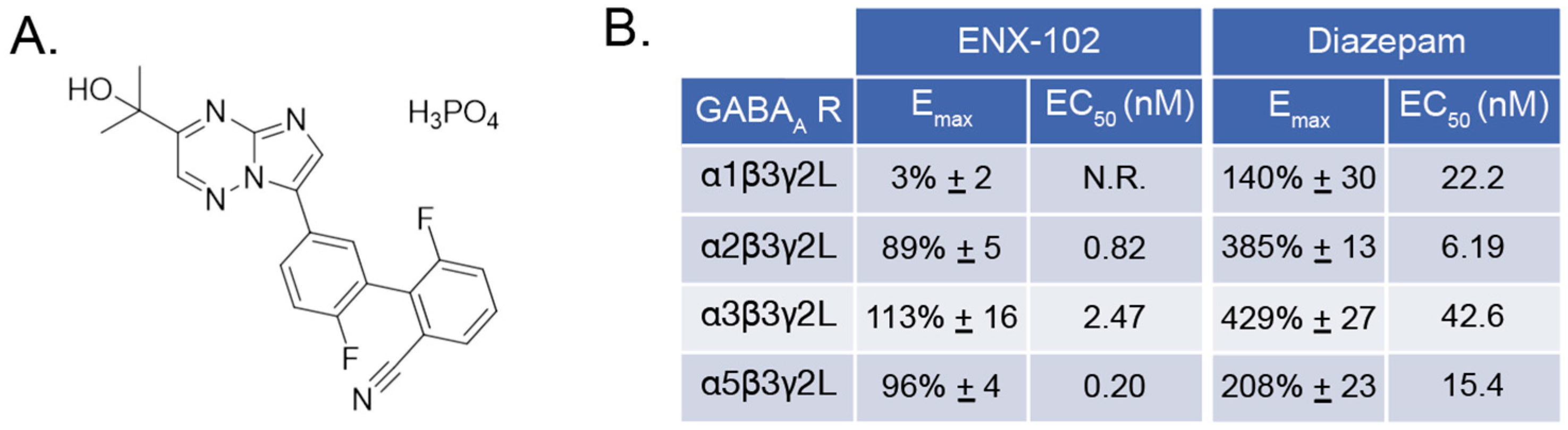 Nettesheim, P.; Vadodaria, K.C.; Vanover, K.E.; Borghans, L.G.J.M.; Arce, E.; Brubaker, W.; Cunningham, S.; Parks, S.; Serrats, J.; Sudarsan, V.; et al. Biomarker-Based Pharmacological Characterization of ENX-102, a Novel α2/3/5 Subtype-Selective GABAA Receptor Positive Allo-Steric Modulator: Translational Insights from Rodent and Human Studies. Cells 2025, 14, 1575. https://doi.org/10.3390/cells14201575