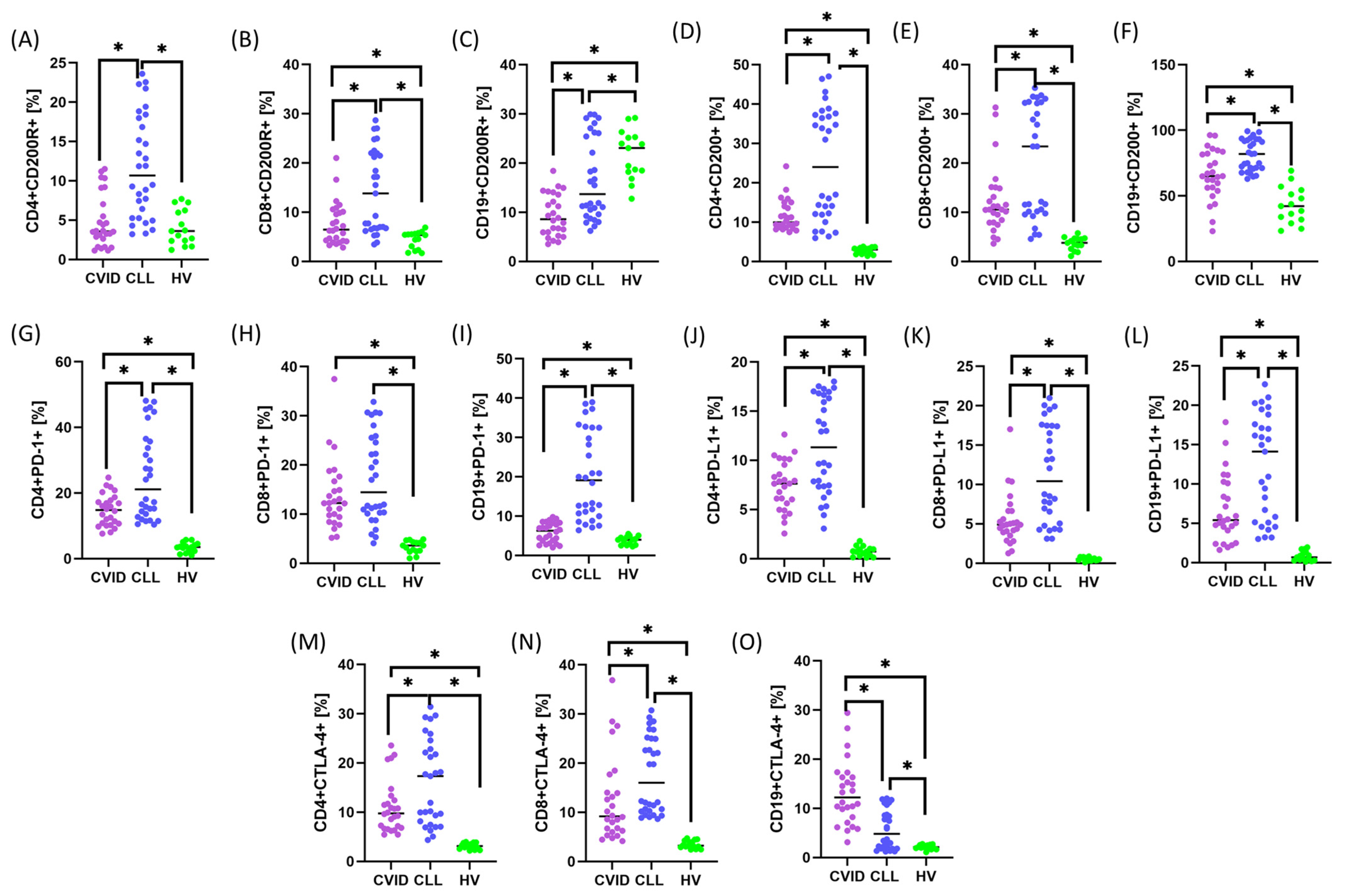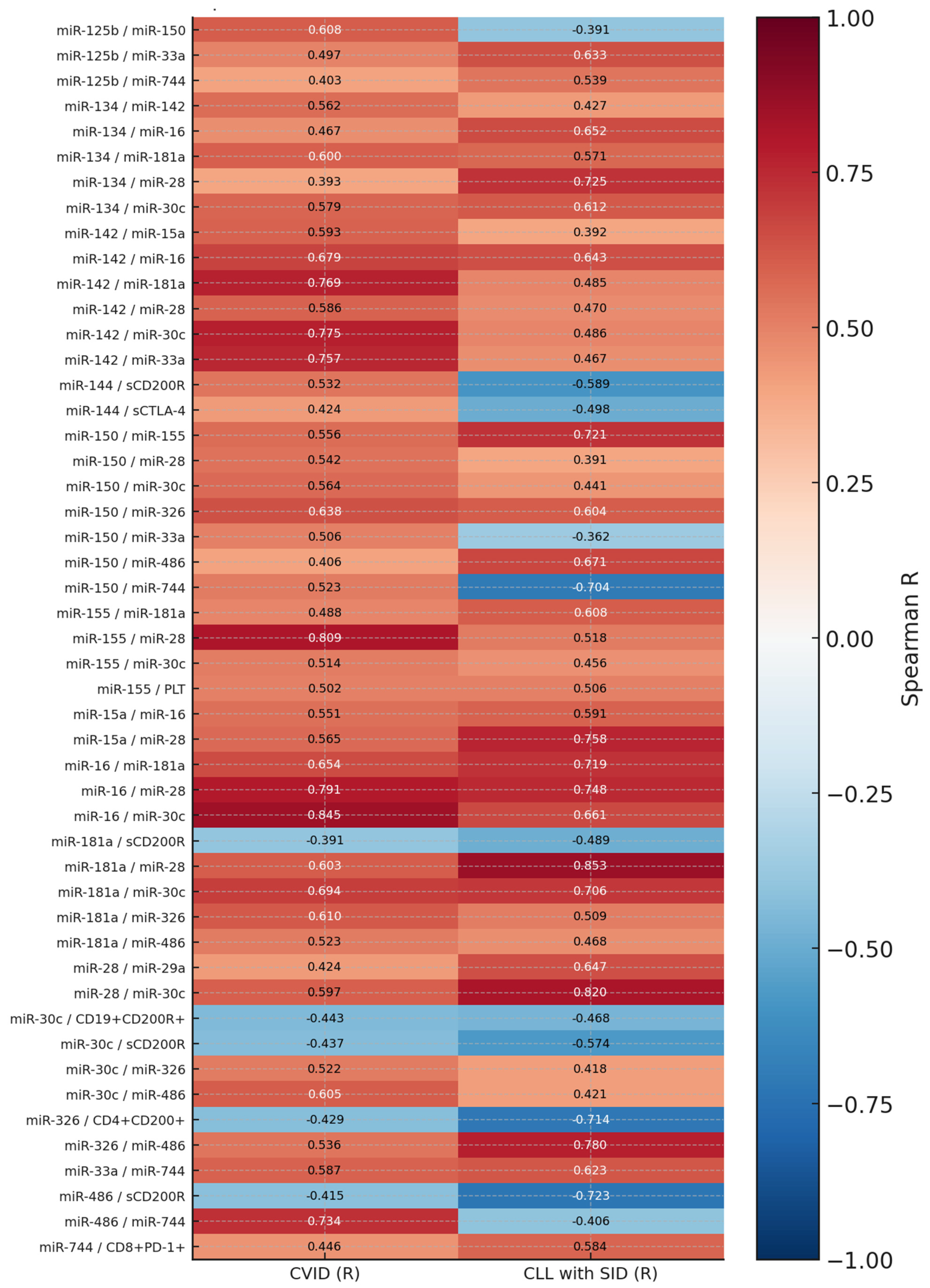 Mertowska, P.; Mertowski, S.; Czosnek, M.; Sosnowska-Pasiarska, B.; Krasińska-Płachta, A.; Krasiński, Z.; Urbanowicz, T.; Bojarski, K.; Rahnama-Hezavah, M.; Grywalska, E. MicroRNA Deregulation and Immune Checkpoint Interactions in Common Variable Immunodeficiency and CLL-Associated Secondary Immunodeficiency. Cells 2025, 14, 1577. https://doi.org/10.3390/cells14201577