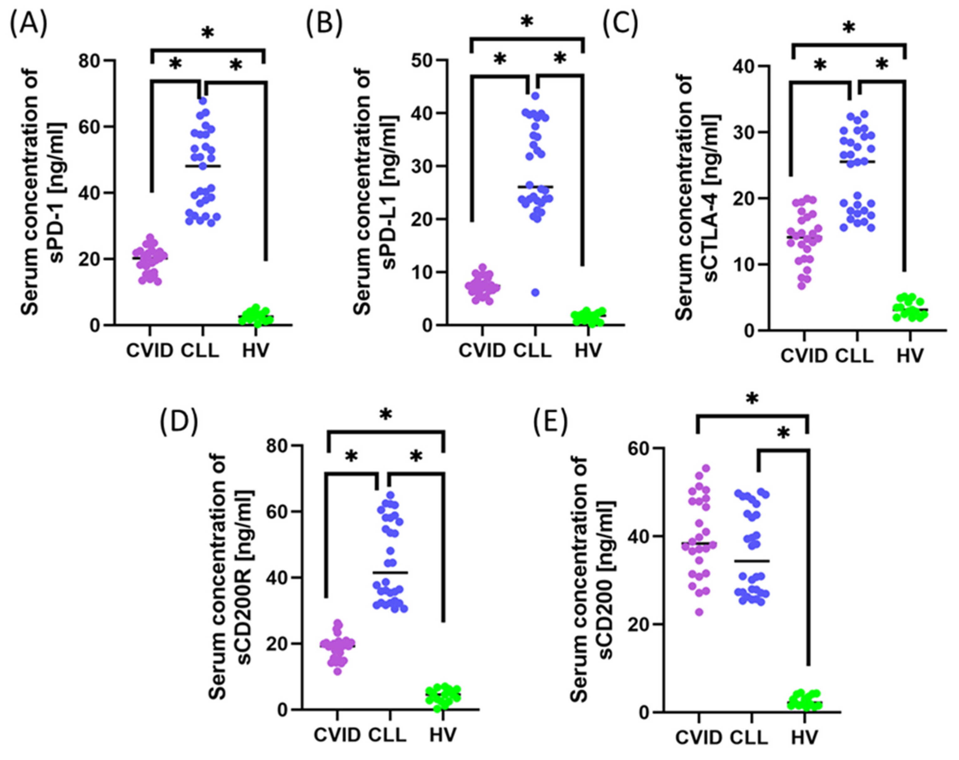 3.1. Assessment of Clinical, Hematological, and Immunological Parameters of the Studied Groups, Including the Percentage of Immune Checkpoints on T and B Lymphocytes and Their Soluble Forms in Serum