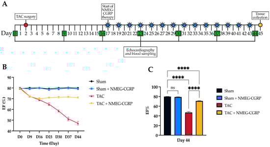 (A) Diagram of the experimental timeline showing blood sampling, echocardiography, NMEG-CGRP treatment schedule. Echocardiograms and blood sampling began two days prior to TAC surgery (Day 0/D0). Following TAC surgery (D2), echocardiograms and blood sampling were performed weekly (D9, D16, D23, D30, D37, D44) until study termination (D45). NMEG-CGRP therapy (3.6 mg/kg/mouse) began at D17 and was administered every other day (D19, D21, D23, D25, D27, D29, D31, D33, D35, D37, D39, D41, D43) until study termination (D45). (B) Longitudinal echocardiographic measurements of ejection fraction (EF) across experimental groups. (C) One-way analysis of variance (ANOVA) of EF across experimental groups on Day 44. ns = not significant, **** p < 0.0001.