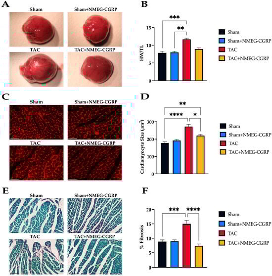 Pressure overload causes structural changes to the heart though increased inflammation and fibroblast proliferation []. Hearts were collected, weighed, photographed, and processed for histological assessment. The heart weight to tibia length ratio (HW/TL) was used to quantify cardiac hypertrophy. Our results showed that gross heart size and HW/TL ratio were larger in TAC mice when compared to sham mice, whereas heart size and HW/TL ratio were reduced in TAC mice treated with NMEG-CGRP (Figure 2A,B). To further assess hypertrophy, left ventricular (LV) sections were stained with WGA, imaged, and cardiomyocyte cross-sectional area was quantified using Cellpose 2.0 and Fiji (Figure 2C) [,]. A significant increase in cardiomyocyte size (µm2) was observed in the TAC group when compared to the Sham group, while a decrease was observed between the TAC and TAC+NMEG-CGRP groups (Figure 2D). In addition, LV fibrosis was assessed using a Sirius Red/Fast Green collagen staining kit and quantified in QuPath 0.5.0 (Figure 2E) []. An increase in fibrosis was observed in TAC mice when compared to sham mice. In contrast, fibrosis was significantly reduced in TAC mice treated with NMEG-CGRP (Figure 2F).