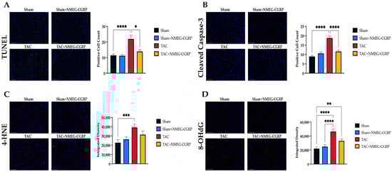 Apoptosis and oxidative stress drive cardiac remodeling in heart failure through reduced cardiomyocyte contractility and mitochondrial dysfunction []. To assess apoptotic cell death, LV sections were separately stained using a fluorometric TUNEL kit and a primary antibody against cleaved caspase-3 (Figure 3A,B). After staining, LV sections were imaged, and positive cell counts were performed in Fiji []. Our results showed that the number of TUNEL-positive and cleaved caspase-3-positive cells was significantly increased in the TAC group when compared to the Sham group (Figure 3A,B). In contrast, positive cell counts were reduced in the TAC+NMEG-CGRP group when compared to the TAC group. To assess oxidative stress, LV sections were separately stained with primary antibodies against 4-hydroxy-2-nonenal (4-HNE) and 8-hydroxy-2′-deoxyguanosine (8-OHdG) (Figure 3C,D). After staining, LV sections were imaged, and integrated density was quantified in Fiji []. Our results showed that the integrated densities of both 4-HNE and 8-OHdG were significantly increased in the LV sections of TAC mice, whereas integrated density were reduced in TAC mice treated with NMEG-CGRP.