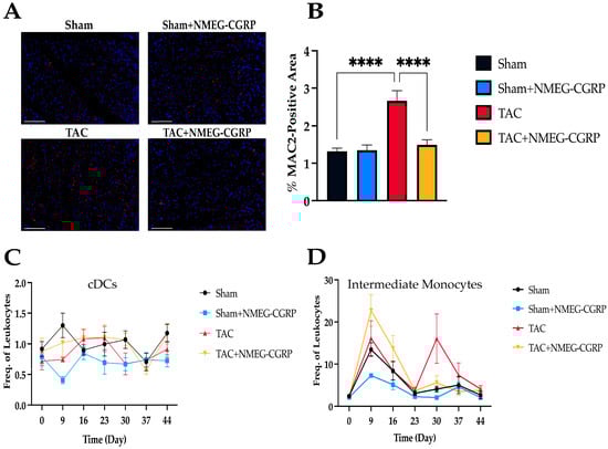 Circulating and tissue-resident pro-inflammatory immune cells are hallmarks of heart failure and correlate with disease severity and outcome []. To assess cardiac inflammation, LV sections were stained with an Alexa Fluor 546-conjugated MAC387 antibody, imaged, and quantified in Fiji (Figure 5A) []. Our results showed that TAC mice had increased macrophage infiltration when compared to sham mice, whereas macrophage infiltration was decreased in TAC mice treated with NMEG-CGRP (Figure 5B). To assess changes in circulating immune cell populations, we collected weekly blood samples which were stained with 20 fluorescently labeled antibodies (Table 1) and 11 immune cell subsets were quantified (Figures S1 and S3A–K). Mixed-effects analysis was used to evaluate time and treatment effects and time (x) treatment interactions. Significant main effects of time were observed across all immune cell populations except for conventional dendritic cells (cDCs), whereas significant main effects of treatment were observed in transitional monocytes (Figure 5C). Significant time x treatment interactions were observed in activated B cells and CD4+ T cells (Figure 5D). The frequency of transitional monocytes remained elevated from Day 23 (D23) to D44 in TAC mice, whereas they remained infrequent across Sham, Sham+NMEG-CGRP, and TAC+NMEG-CGRP groups (Figure 5C). The frequency of activated B cells and CD4+ T cells in TAC mice treated with NMEG-CGRP exhibited similar fluctuation patterns from D23 to D44.