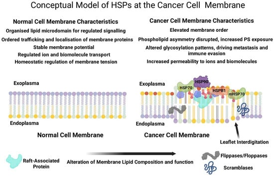 As discussed later, regarding the role of HSPs in membrane dynamics during cellular transformation, a key focus concerns the functional significance of HSPs within the lipid raft microdomains. Understanding their role in these PM structures is essential for a comprehensive view of their impact on cellular adaptations. While raft-resident proteins, particularly receptors that mediate diverse cellular functions, rely on the lipid raft platform—a system partly modulated by the HSPs—we hypothesize that HSPs stabilize and control the aberrant interactome at the intra-extracellular signaling gateway via a dual mechanism: modulating the lipid raft composition and stability and the proteome-wide interactome in the raft. HSPs, potentially through chaperoning protein folding and preventing aggregation, maintain proteostasis. Furthermore, HSPs support the stability of the lipid raft platform, which is crucial for robust signal transduction. Thus, investigating HSPs within the heterogenous plasma membrane compartments offers new avenues for understanding and targeting cellular transformation, suggesting therapeutic strategies based on modulating HSP-mediated protein interactions.