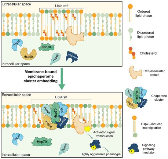 Potential role of membrane-bound epichaperome in cell functioning via alteration of membrane biophysical properties. By incorporating into ordered membrane domains of cancer cells, various members of HSPs can form a stable chaperone cluster and influence the biophysical properties of the lipid bilayer. For instance, HSP70 increases the area of ordered domains and induces interdigitation. HSP27, HSP60, and HSP90 reduce fluidity and increase rigidity. This leads to altered functioning of raft-associated proteins and activation of corresponding signaling cascades that promote the aggressive phenotype of cancer cells.