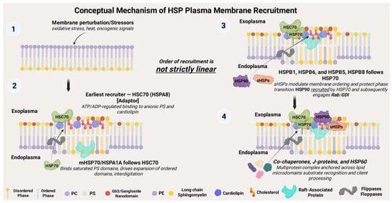The nature of the HSP–lipid raft interactions shows a high predilection for the highly negatively charged phospholipids, particularly phosphatidylserine (PS), palmitoyl-oleoyl phosphatidylglycerol (POPG), glycosphingolipid Gb3, sulfogalactosyl ceramide, and bis(monoacylglycero)phosphate (BMP) [71], all of which carry high negative charges. While not entirely positively charged, HSPs carry patches of positively charged amino acids (AA), hydrophobic regions, and polar AA that mediate hydrophobic and steer electrostatic interactions that are supported by lipid clustering [37,53,61,72]. Figure 3 shows a conceptual model of the order of HSP recruitment to the plasma membrane in response to stressors reported in the context of cancer.