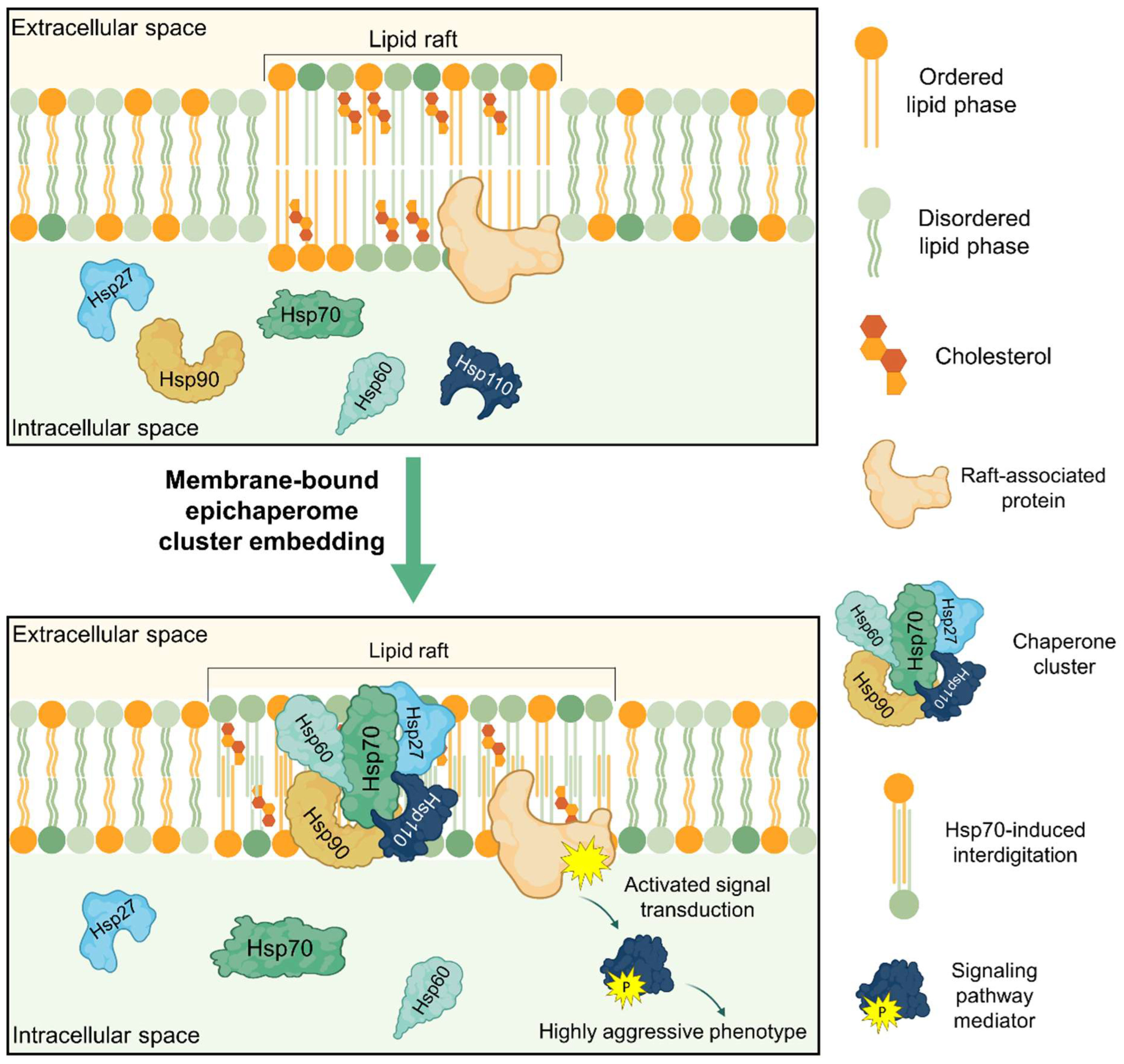 67]. Importantly, lipid rafts tailor membrane identities and docking sites that function as molecular hubs for proteome-wide membrane interactions and trafficking. It is within these molecular hubs that HSPs reside, a localization that has been supported by demonstrable evidence [