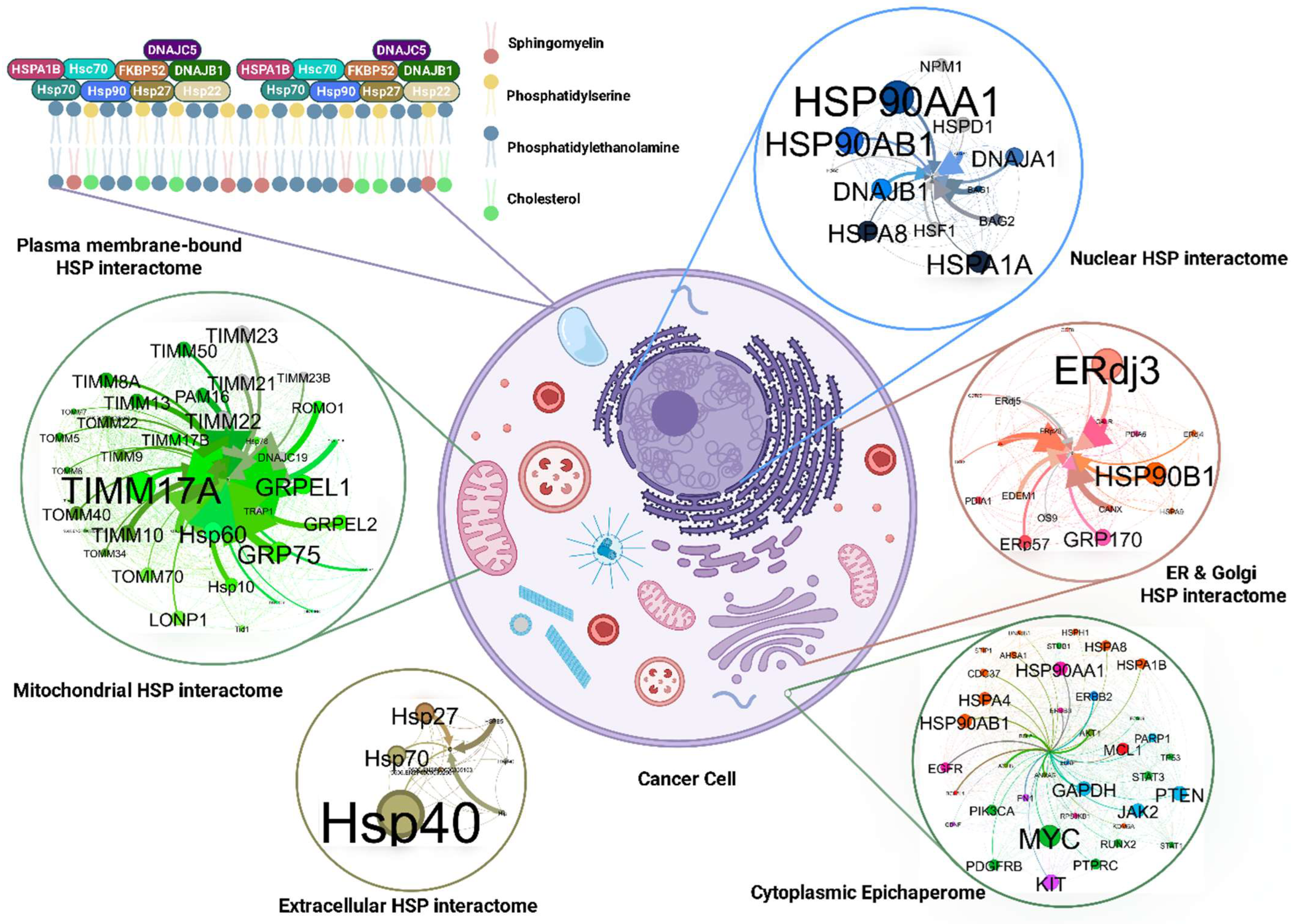 Figure 2). This intricate chaperone–lipid–effector protein interplay expands interactome networks, broadening chaperone functionality in cells. For cancer cells, the enhanced signaling and stabilized membrane platforms resulting in the chaperone–lipid effector protein reciprocal interaction may therefore serve as an additional protective mechanism, bolstering their survival and facilitating their dissemination. These findings demonstrate the inextricable linkage between the epichaperome and membrane biophysics and their mutual regulation. A comprehensive study of lipid-protein interactions will deepen our understanding of cellular events.
