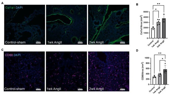 Next, the lung sections were also examined for collagen deposition and macrophage infiltration. As mentioned previously, collagen deposition is a hallmark feature of fibrotic tissue remolding. Thus, AngII can promote collagen deposition both in the lung and kidney. Here, we employed col1a1 immunofluorescence staining to assess collagen production in the lungs following AngII infusion. Our results revealed a progressive increase in collagen deposition over time, with levels becoming more pronounced as the treatment continued (Figure 2A,B). Although our analysis reflects the entire lung section for col1a1 staining, prior studies have shown that AngII induces collagen deposition in both parenchymal and perivascular compartments [7,26,27]. Macrophage presence was identified in lung tissue using immunofluorescence staining for CD68, a well-established myeloid cell marker that is abundantly expressed by macrophages [28]. Evidence indicates that AngII-mediated macrophage recruitment is involved in fibrotic remodeling of both lung and kidney tissues [1,7,29]. In this study, immunohistochemical analysis of CD68+ cells of lung sections from control (saline sham), 1-week AngII-infused, and 2-week AngII-infused mice showed a progressive increase in CD68++ cells (Figure 2C,D). Collectively, consistent with previous reports, these findings demonstrate that AngII infusion promotes progressive macrophage recruitment to the lung, as reflected by increased CD68+ cell abundance, together with increased collagen production.