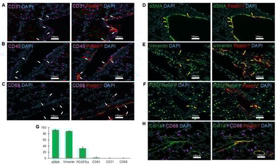 Periostin-lineage cells colocalize with fibrogenic but not immune or endothelial markers in the lung following AngII treatment. (A–C) Representative immunofluorescent images showing lack of co-labeling (white arrows) between periostin-lineage (tdTomato+) cells and cellular markers of endothelial (CD31, (A)), hematopoietic (CD45, (B)), and macrophage (CD68, (C)), indicating that activated PostnLin in response to AngII infusion do not originate from these cell types (n = 3–4 per marker). (D–F) Periostin-lineage cells show colocalization with fibroblast markers: α-SMA (D), vimentin (E), and PDGFRα-GFP (F), suggesting an activated fibroblast phenotype (yellow arrows indicate areas of co-labeling). (G) Quantification of co-labeling of tdTom+ (periostin+) cells with indicated cell markers from immunohistochemically processed lung sections of AngII pump-implanted mice. Data represents an average of three to four lungs per marker, with >5 sections quantified from each. Data are presented as mean ± SEM. (H) Representative immunofluorescent image of collagen type 1 (col1a1), macrophages (CD68), and PostnLin cells. Images are representative of lungs harvested after AngII treatment (n = 3/4 per marker). tdTomato⁺ periostin-lineage cells are shown in red; nuclei (DAPI) in blue; CD31, CD45, and CD68 in magenta; and α-SMA, vimentin, PDGFRα-GFP, and Col1a1 in green. Scale bar = 100 µm.