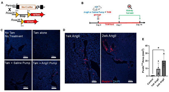 Experimental design and periostin-lineage cell activation in kidney following AngII infusion. (A) Schematic representation of the Postn genetic locus with a tamoxifen-regulated MerCreMer crossing with Rosa26-tdTomato reporter mice. (B) Experimental design showing that tamoxifen (TAM) was administered via oral gavage on the day of either AngII or saline mini-pump implantation. Kidney was harvested on days 7 and 14 post-treatment. (C) Representative kidney images show baseline and control conditions. (D) Representative kidney sections from mice treated with AngII for 1 week and 2 weeks show progressive activation and expansion of tdTomato+ periostin-lineage cells. (E) Quantification of periostin-lineage (tdTomato+) cells per mm2 in kidney tissue reveals a significant and progressive increase following 1 and 2 weeks of AngII treatment compared to saline pump control (n = 3–4 per group). For each sample, at least four 10× images from distinct regions and depths of the kidney were quantified. Data are presented as mean ± SEM. (* = p < 0.05, one-way ANOVA with Tukey’s post hoc test). tdTomato⁺ periostin-lineage cells are shown in red, and nuclei (DAPI) are shown in blue. Scale bar = 100 µm.